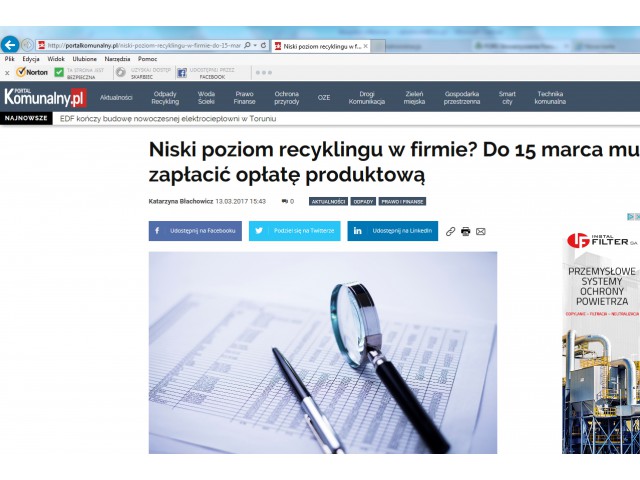 1. Portal PORTALKOMUNALNY.PL – artykuł „Niski poziom recyklingu w firmie? Do 15 marca musisz zapłacić opłatę produktową”