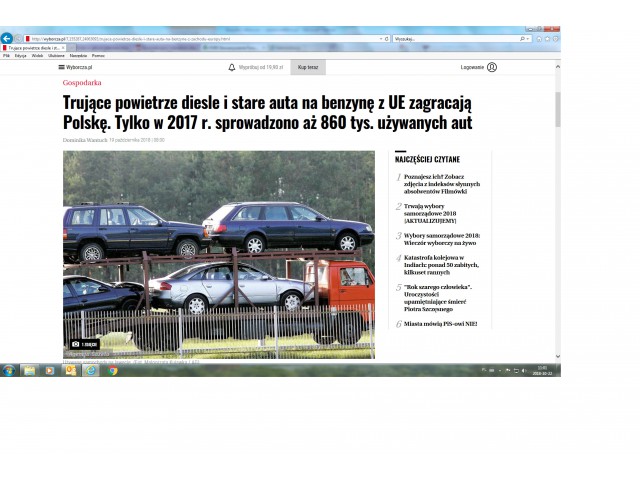 2. Portal WYBORCZA.PL – artykuł ” Trujące powietrze diesle i stare auta na benzynę z UE zagracają Polskę. Tylko w 2017 r. sprowadzono aż 860 tys. używanych aut.