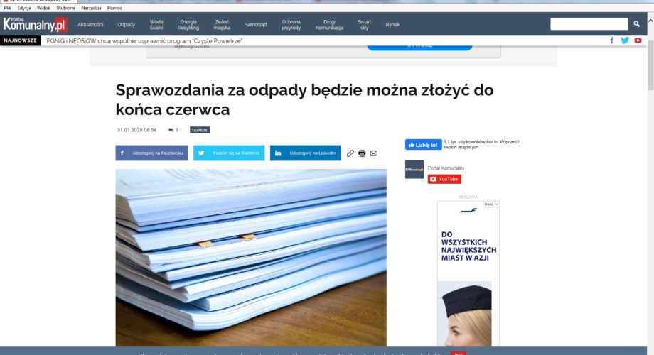 1. Portal KOMUNALNY.PL – artykuł „Sprawozdania za odpady będzie można złożyć do końca czerwca”
