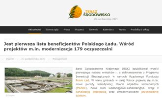 Portal Teraz Środowisko – artykuł „Jest pierwsza lista beneficjentów Polskiego Ładu. Wśród projektów m.in. modernizacja 179 oczyszczalni” Teraz Środowisko: Jest pierwsza lista beneficjentów Polskiego Ładu.
