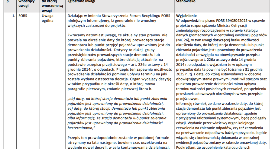 W przypadku utrzymania zasad z art. 226a ustawy o odpadach w ocenie Stowarzyszenia FORS niezbędna będzie zmiana Rozporządzenia.