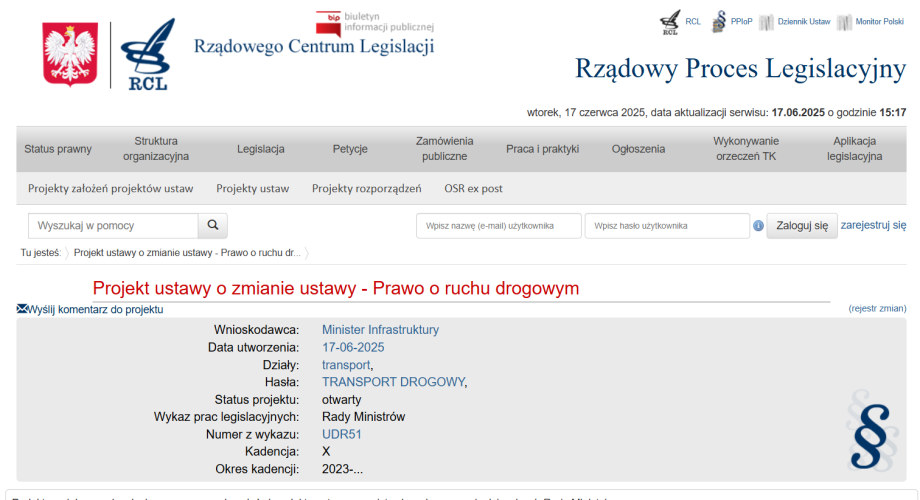 Projekt ustawy o zmianie ustawy – Prawo o ruchu drogowym