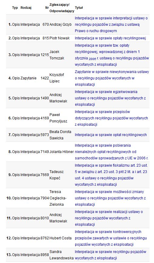 Zestawienie Interpelacji i zapytań złożonych przez posłów V kadencji Sejmu RP w sprawie recyklingu pojazdów wycofanych z eksploatacji i odpowiedzi na te zapytania udzielone przez administrację.