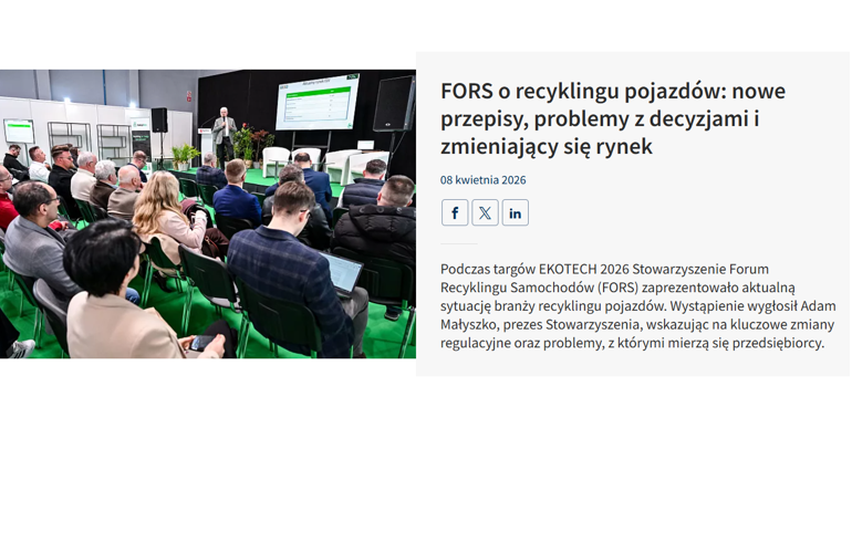 Za nami intensywny start 26. edycji targów EKOTECH pełen rozmów, spotkań i prezentacji nowoczesnych rozwiązań dla gospodarki odpadami. Tematyka zagospodarowania pojazdów wycofanych z eksploatacji zyskuje dziś szczególne znaczenie – zarówno regulacyjne, jak i środowiskowe. Dużym zainteresowaniem cieszyły się zagadnienia dla transportu i przetwarzania odpadów, w tym ważnym punktem programu dla całej branży był panel Stowarzyszenia FORS pod hasłem „Recykling pojazdów 2026 – co nas czeka”.